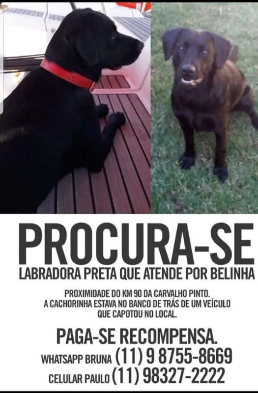 Labradora toda preta, porte médio, pelo baixo brilhante, com uma coleira vermelha, dócil, sociável, 2 anos de idade, atende pelo nome de Bela ou Belinha, extraviou-se apos um acidente no dia 27 dez na Rodovia Carvalho Pinto, km 90 sentido São Paulo São José dos Campos, foi vista pela última vez às 7:30 hs no Km 87 dia 28 dez.