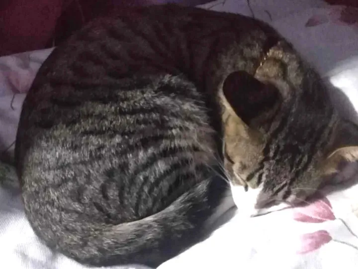 Um gato de porte médio, branco esverdeado ele está com uma colera com um pingente do escudo da fé