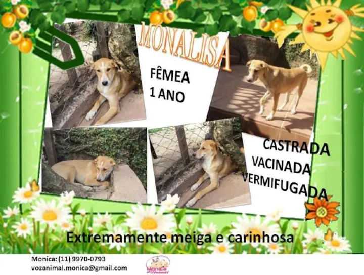 Conheça a Monalisa, uma cadela SRD de 1 ano, super carinhosa e feliz. Adote essa companheira incrível em Embu/SP e transforme sua vida!