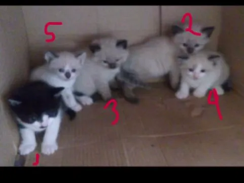 1-O Snowball é macho, é branco com manchas pretas,e te olhos azuis;2-a lili é branca com rabo e orelhas pretas e olhos azuis; 3- Charlie é branco com rabo, patas e orelhas pretas; 4- o pooh e banco com Beje, tem rabo e orelhas preras, focinho rosa, olhos azuis; 5- o dusty é branco com Beje e tem rabo,orelhas focinho preto..