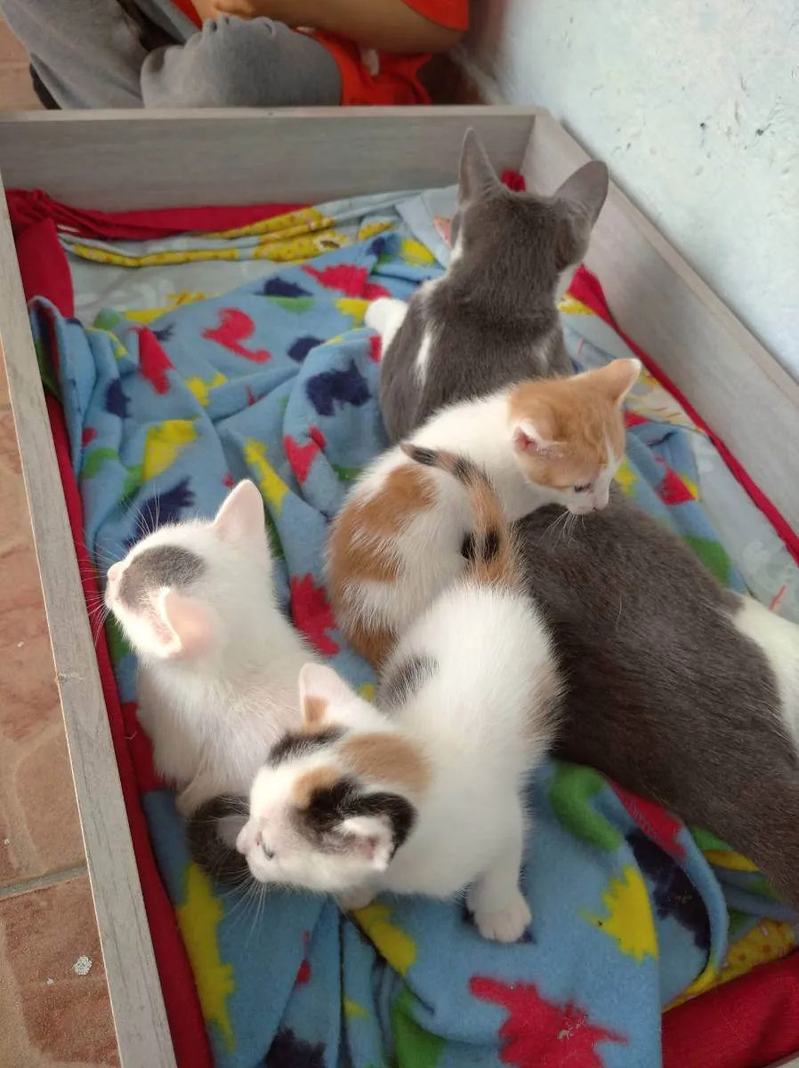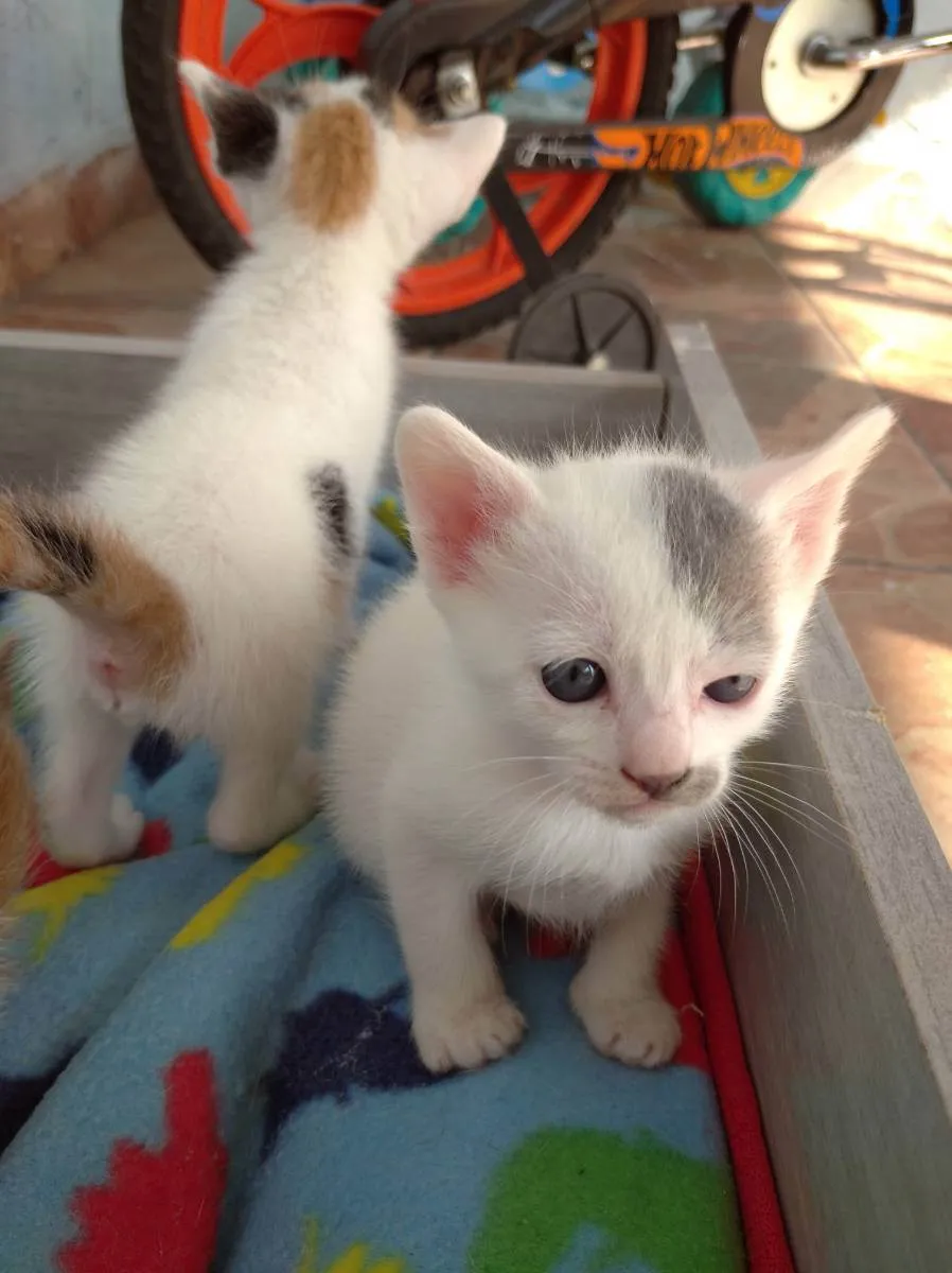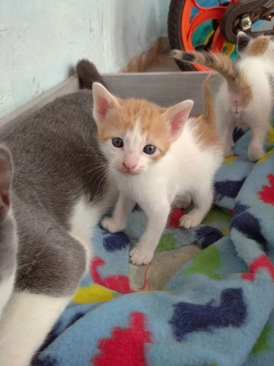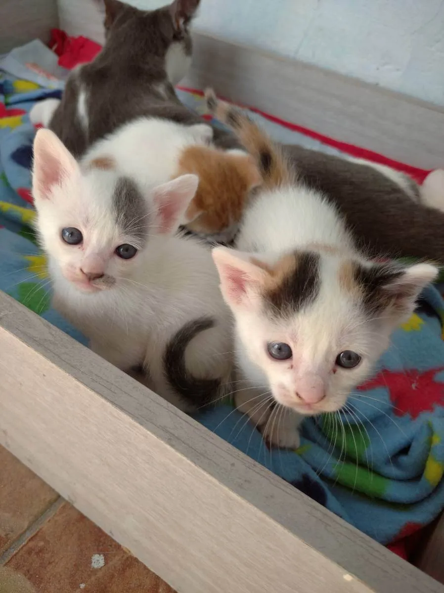 São 4 filhotes 2 fêmeas 2 machos são lindos, resgatamos a mamãe da rua e ela deu a cria aqui e eu não posso ficar com tantos gatos por condições financeiras tbm que não é só ter os gatos em casa tem que ter um cuidado com alimentação e medicação que não está no meu alcance no momento.