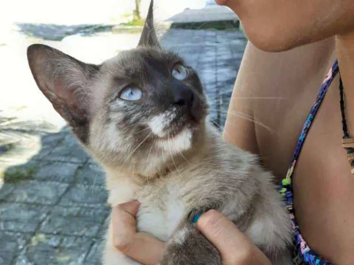 Encontrada na rua vitorio morbim, vila caiçara na praia grande. Ela está em frente a uma casa com portão marrom de madeira ao lado da casa 257 Tem duas cores sendo uma marrom e outra branca. É bem mancinha e mia bastante moro em SP vim de férias e enquanto estiver aqui tô dando ração pra ela.