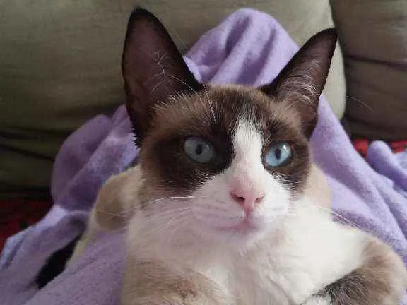 Gata chama-se Adora tem pelo curto com tons de marrom e branco. Olhos são azuis orelhas e rabo preto/marrom escuro.