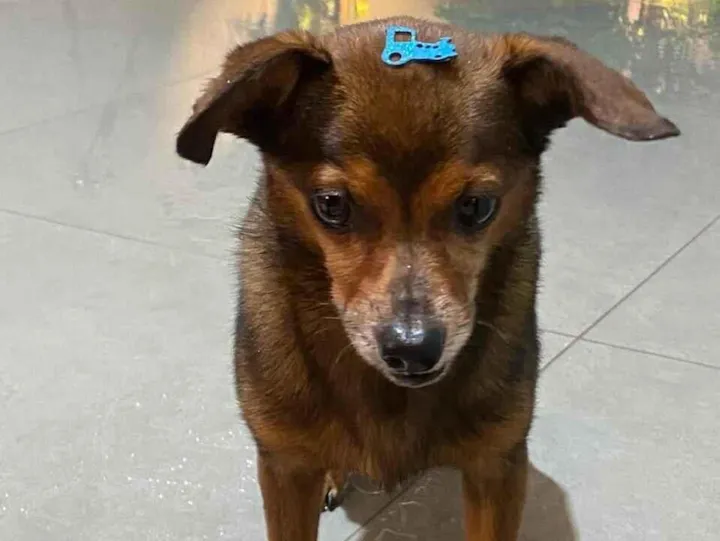 Cachorrinho encontrado na Rua Doutor Júlio Cardoso, centro, Franca SP, macho, pequeno, enfeite azul na cabeça.