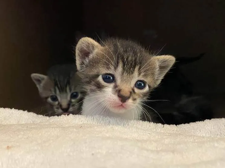 Procura-se lar para dois gatos filhotes, com 1 mês de vida, já comendo ração. Tivemos que desmamar antes do esperado porque a mãe teve mastite, mas ambos já se adaptaram bem a ração seca. O macho é o de pelagem cinza e a femêa é a que tem detalhes branco pelo corpo.