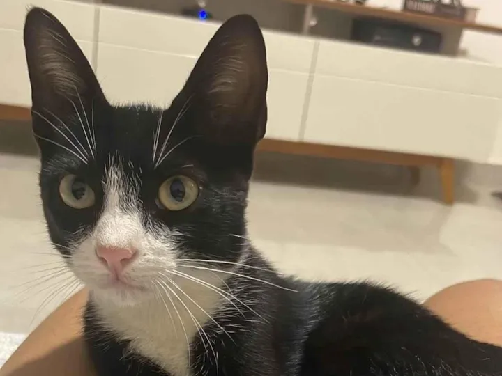 Mingau é preto com manchas brancas nas patinhas, rosto e pescoço. Sumiu nas imediações do Jardim Botânico, Paraty, Primo Meneghetti