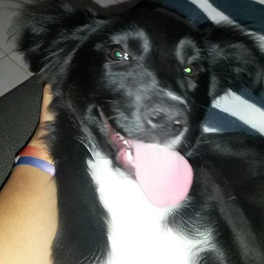 Sou um cachorro pretinho que parece estar vestindo um smoking por causa do pelo branco no peito.