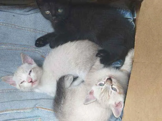 Gatinhos filhote com 2 meses comendo ração e os três são machos