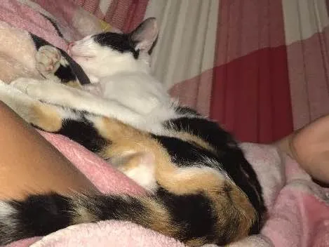 Essa gatinha apareceu aqui no estacionamento do apartamento em que estou aqui no guarujá, pelo fato de ela ter ficado horas lá embaixo, estamos dando um lar temporário, água e comida. Perguntamos para os vizinhos se eles sabem de quem é e ngm sabe informar! O que acontece é que moro em São Carlos e vou embora amanhã, mas não posso levá-la comigo pois já tenho 4 gatos e como moro em apartamento, não tem como adotar mais um. Por isso, procuro o dono ou alguém que possa adotar ou dar um lar temporário para ela, ela é super dócil e carinhosa. Por favor, me ajudem a achar um lugar pra ela.