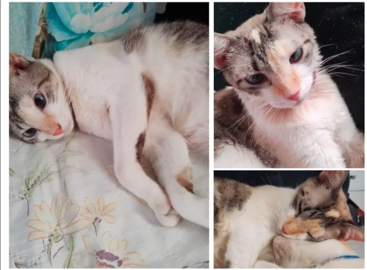 Ela é jovem adulta. Tem um pelo meio branco e caramelo, tem o corpo meio longo. mas um rosto que aparenta ser uma gata jovem. Não costuma miar muito e quando desapareceu, estava com uma coleira roxa.