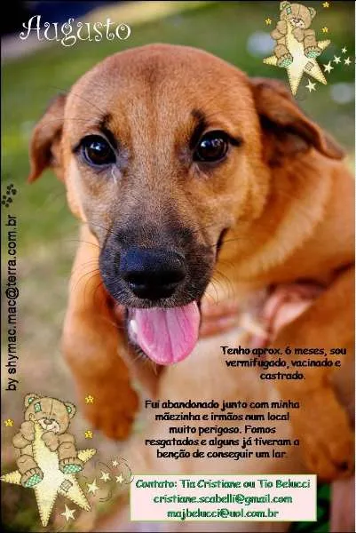 Olá, sou o Augusto, fui abandonado junto com minha mãezinha e irmãos num local muito perigoso. Fomos resgatados e alguns já tiveram a benção de conseguir um lar.