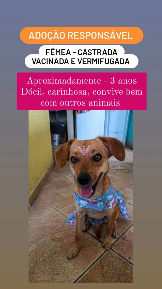 Fêmea, castrada, vermifugada, vacinada contra raiva.