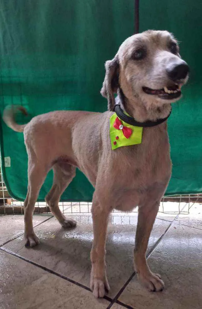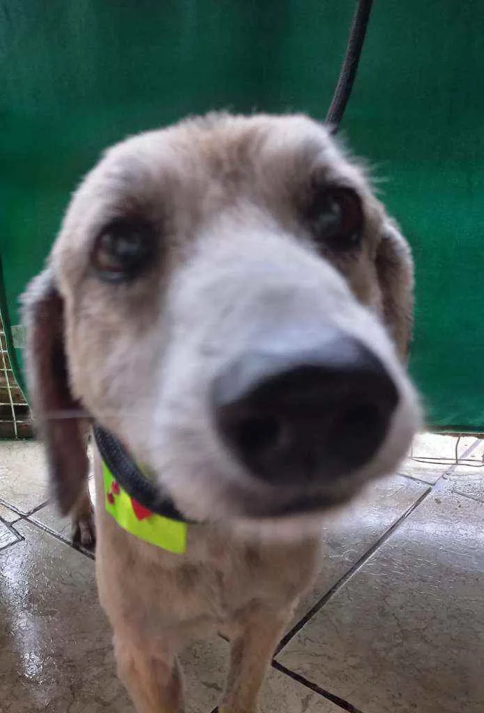 Meiga, medrosa, super dócil, porte médio pequeno, deve pesar uns 14kg, e tem por volta de 8 anos.
