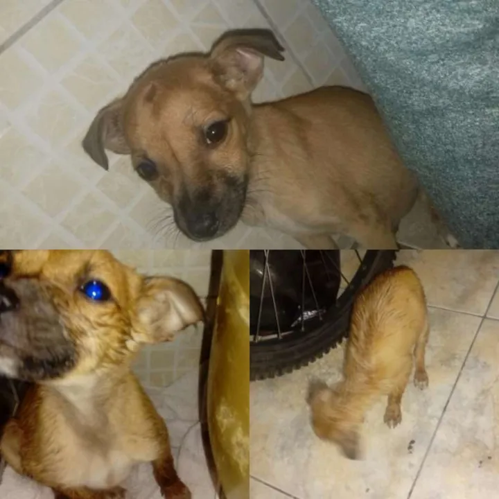 Cachorro pequeno. Está na rua perto da minha casa tomando chuva. Não posso cuidar, pois meus pais não querem e eu moro com eles. Levo no local.