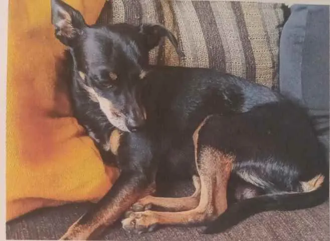 Ted é um cão de estatura baixa, muito ágil, gosta de sair para caminhar. É muito amoroso. Tem predominância preta e as pernas e peito marron. Perdeu um dentinho da frente.