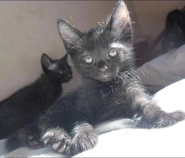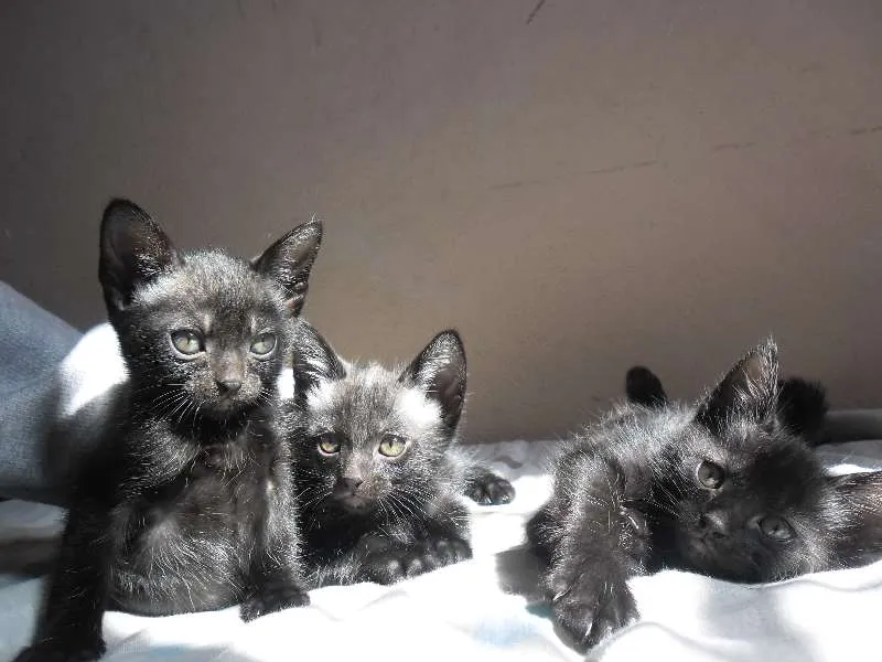 3 filhotes de gato. Cinzas escuro, com pelagem curta pra média.