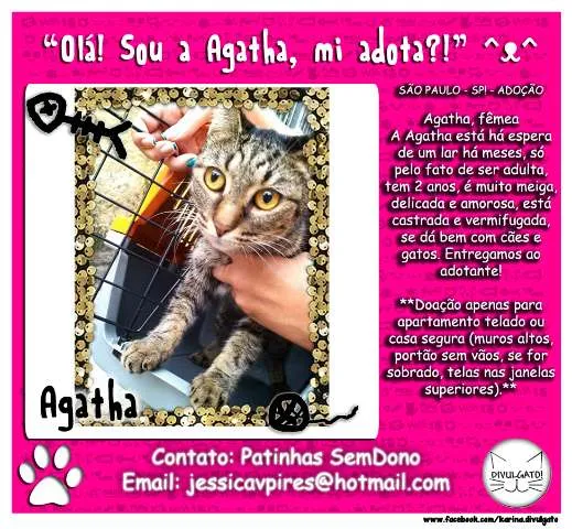 A Agatha está há espera de um lar há meses, só pelo fato de ser adulta, tem 2 anos, é muito meiga, delicada e amorosa, está castrada e vermifugada, se dá bem com cães e gatos. Entregamos ao adotante!
