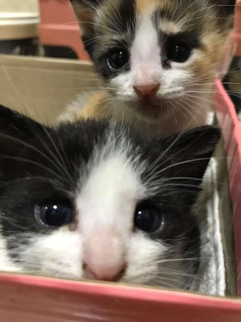 Estou à procura de um lar para esses dois bebês... Não consegui definir o sexo, mas parece ter uma menina e um menino. Sendo menina a amarelinha e menino o pretinho com branco. Os dois são dóceis e bem carentes...