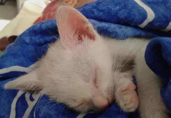 Lindos gatinhos brancos, super doceis e amorosos, abandonados pela mãe em galpão de fábrica, correndo risco pela movimentação de empilhadeiras.