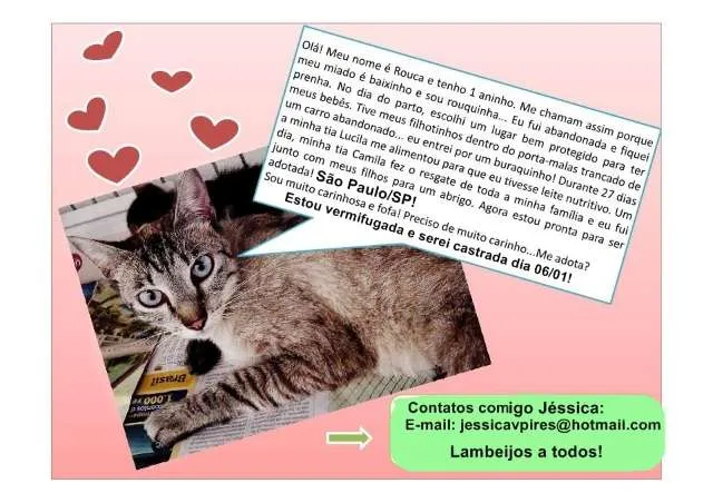 Essa lindinha de pelagem lynx point (nome da cor do pelo) foi resgatada com seus 5 filhotes, ela os teve e cuidou dentro de um porta malas de carro até ser resgatada com seus filhotes. Ela tem aprox. 1 aninho, está vermifugada e será castrada dia 06/01, é carinhosa, fofa e amorosa, se dá bem com gatos e está apenas esperando por um lar.