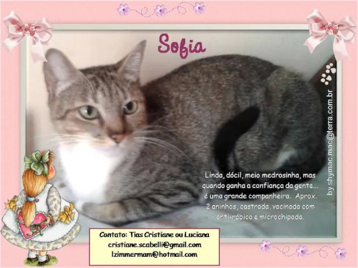 aproximadamente 2 anos de idade, dócil, meio medrosinha, mas ganhando a confiança da gente é uma super companheira. Castrada, vacinada com anti-rábica e microchipada. Doação somente para locais seguros.
