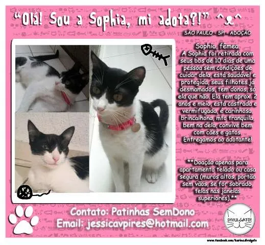 A Sophia foi retirada de uma pessoa sem condições de cuidar dela, está saudável e protegida, seus filhotes já tem donos, só ela que não. Ela tem aprox. 2 anos e meio, está castrada e vermifugada, é carinhosa, brincalhona, mto tranquila, bem na dela, convive bem com cães e gatos. Entregamos ao adotante!