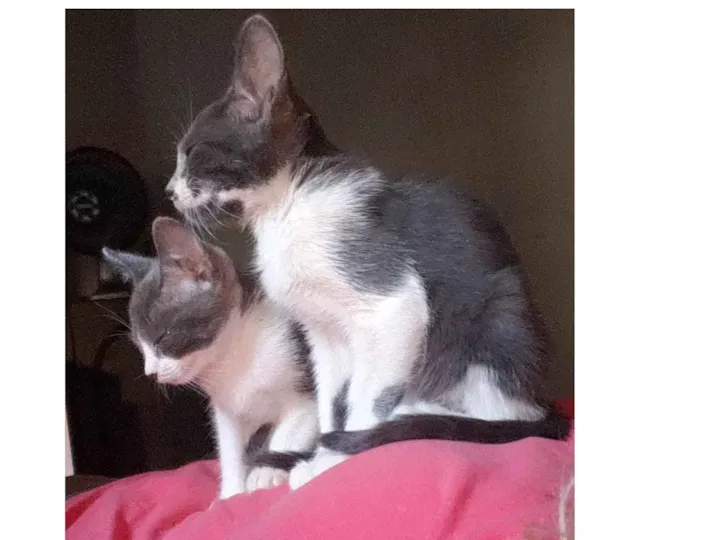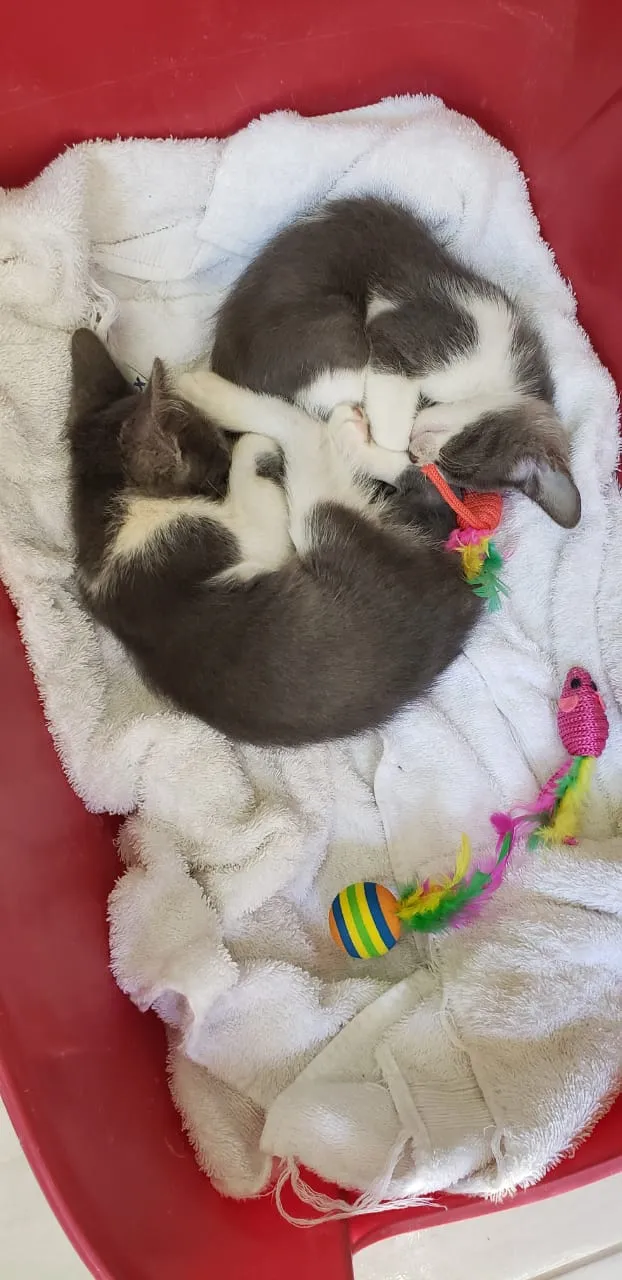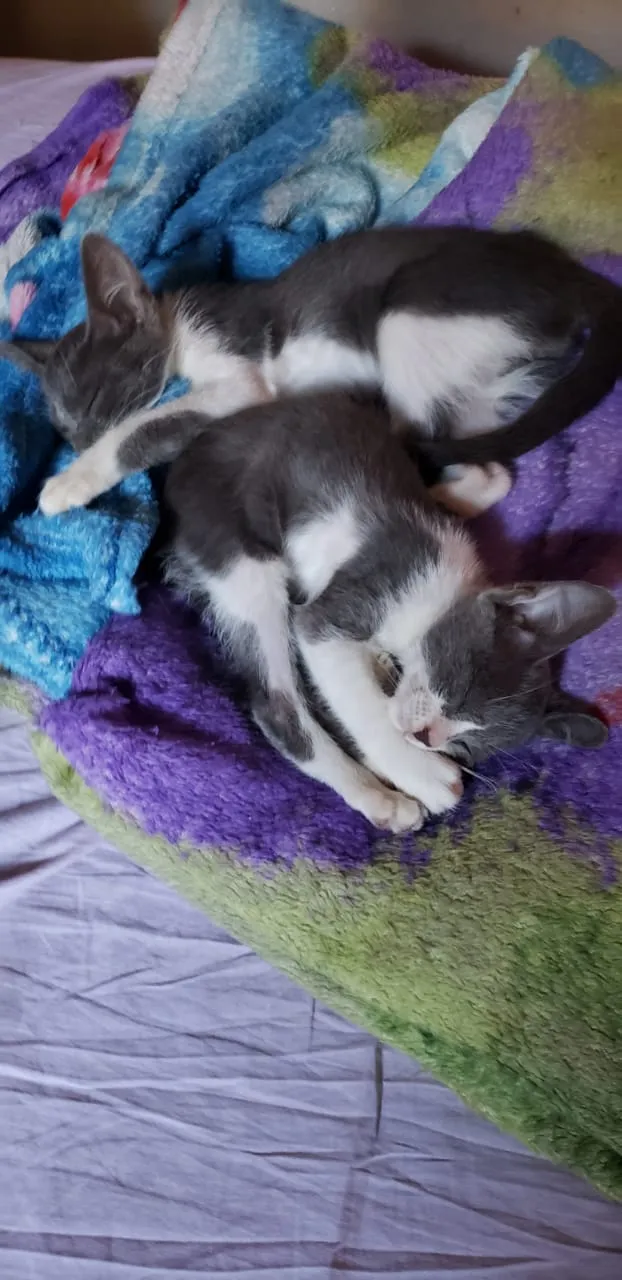 Eles tem em torno de 2 meses, já foram vermifugados, a pelagem é curta (SDR)branca e cinza, os olhinhos verdes e são extremamente carinhosos. Gostam muito de ficar em nossa companhia.