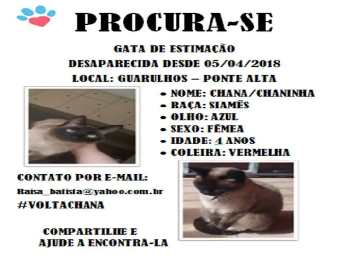 Por favor, gostaria que vocês anunciasse o desaparecimento de minha gata de estimação.O nome dela é "Chana/Chaninha", é castrada, vermifugada e vacinada.Desapareceu no dia 05/04/2018.Moramos em Gua...