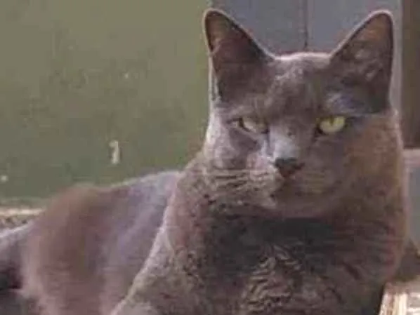 Cinza de olhos verdes e porte grande, manca da perna traseira direita.