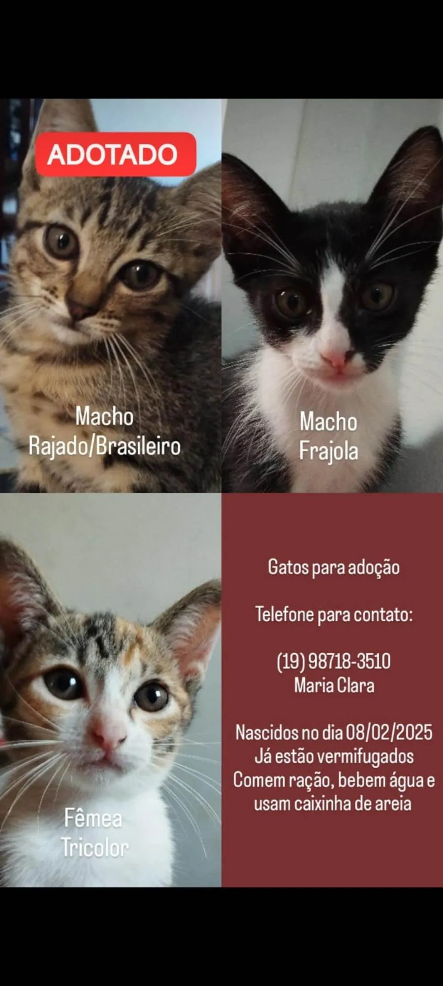 Doando dois gatinhos com 3 meses. Um frajola (Macho) e uma tricolor (Fêmea). Ambos são super dóceis, amam brincar e carinho. A tricolor gosta de colo e é muito calma, o frajola é super agitado e não gosta muito de ser pego no colo.