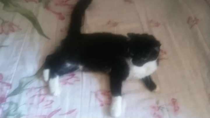 Nariz metade branco metade preto. Por cima das costa dela e toda preta. So tem branco debaixo de toda barriga e as 4 patinhas brancas.O rabo. Bastante peludo.E castrada muito dorcil