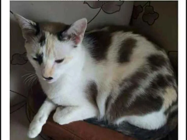 A Nininha é uma gatinha carinhosa e assustada. Branca com manchas marrom e amareladas nas costas e uma pinta preta no bigode. Pode se esconder se estiver machucada pois caiu do telhado.