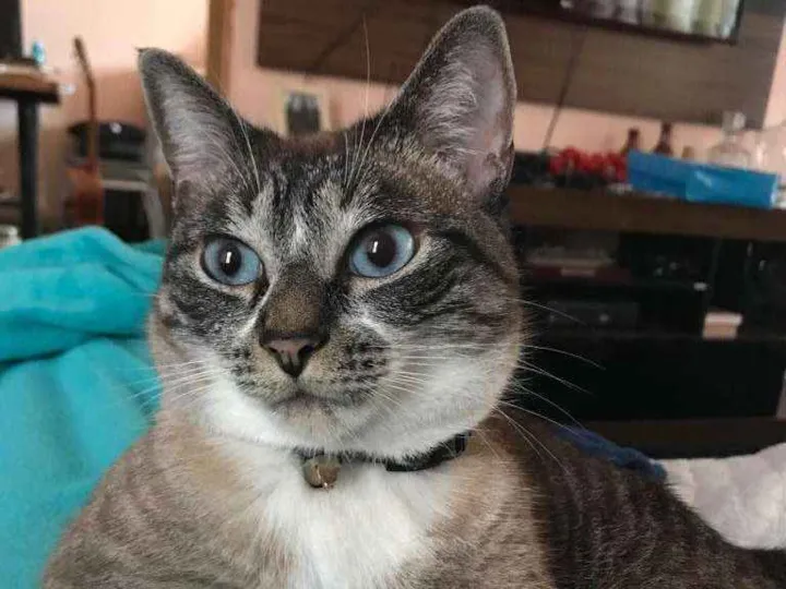 ela tem uma pintinha pequena no nariz, é toda malhada com marrom e branco, tem uma coleira com uns triângulos desenhados. última vez vista: Av. José Luiz braga filho, jardim portela