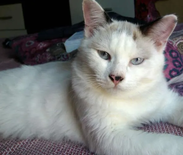 seus olhos são azuis, de pelagem branca e longa, com