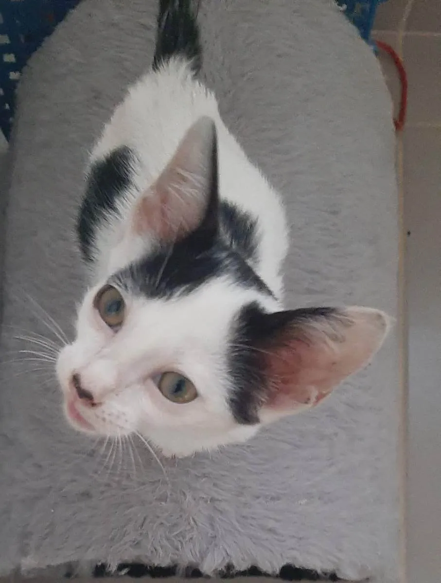 É um gato filhote pequeno com orelhas grandes, de olhos verdes. Precisa de um lar amoroso com pessoas amorosas que não abandone. Ele é dócil, amoroso e carinhoso. É muito brincalhão.