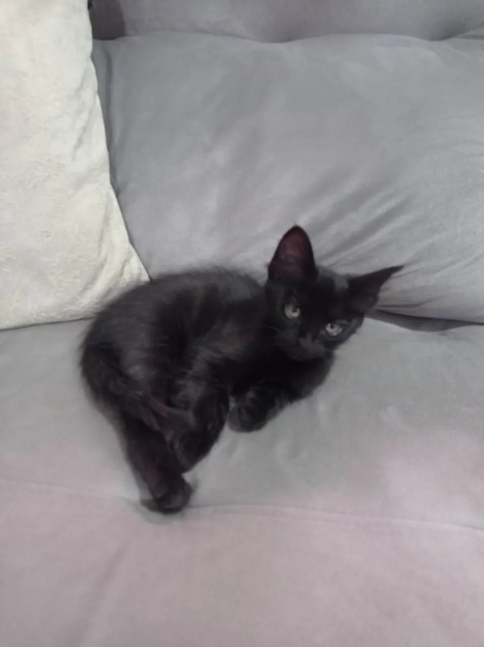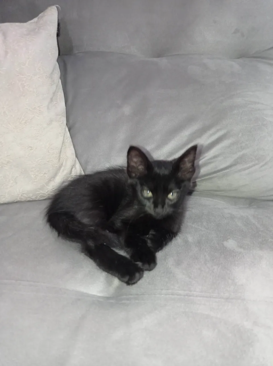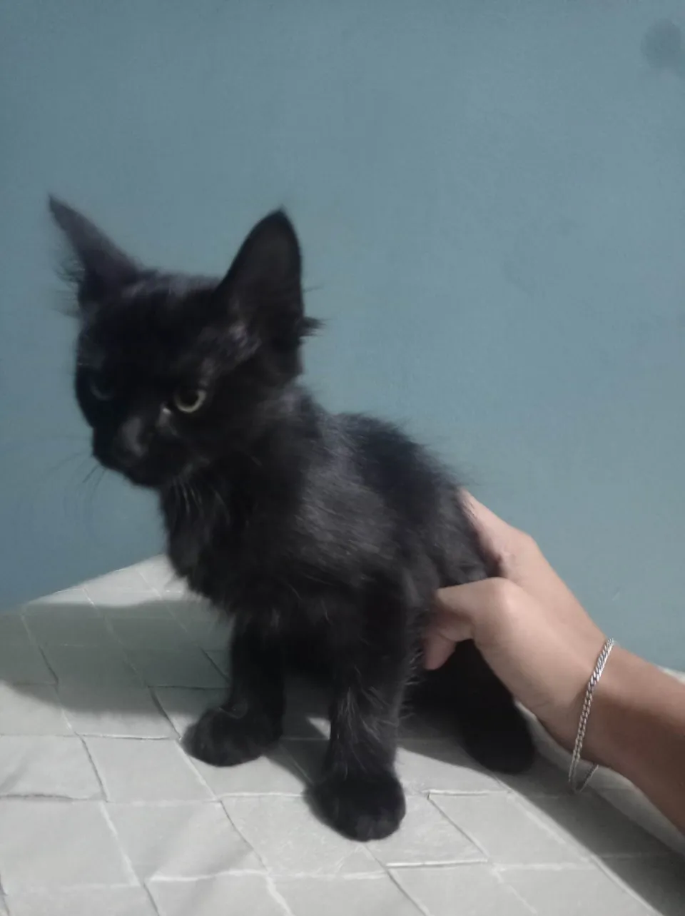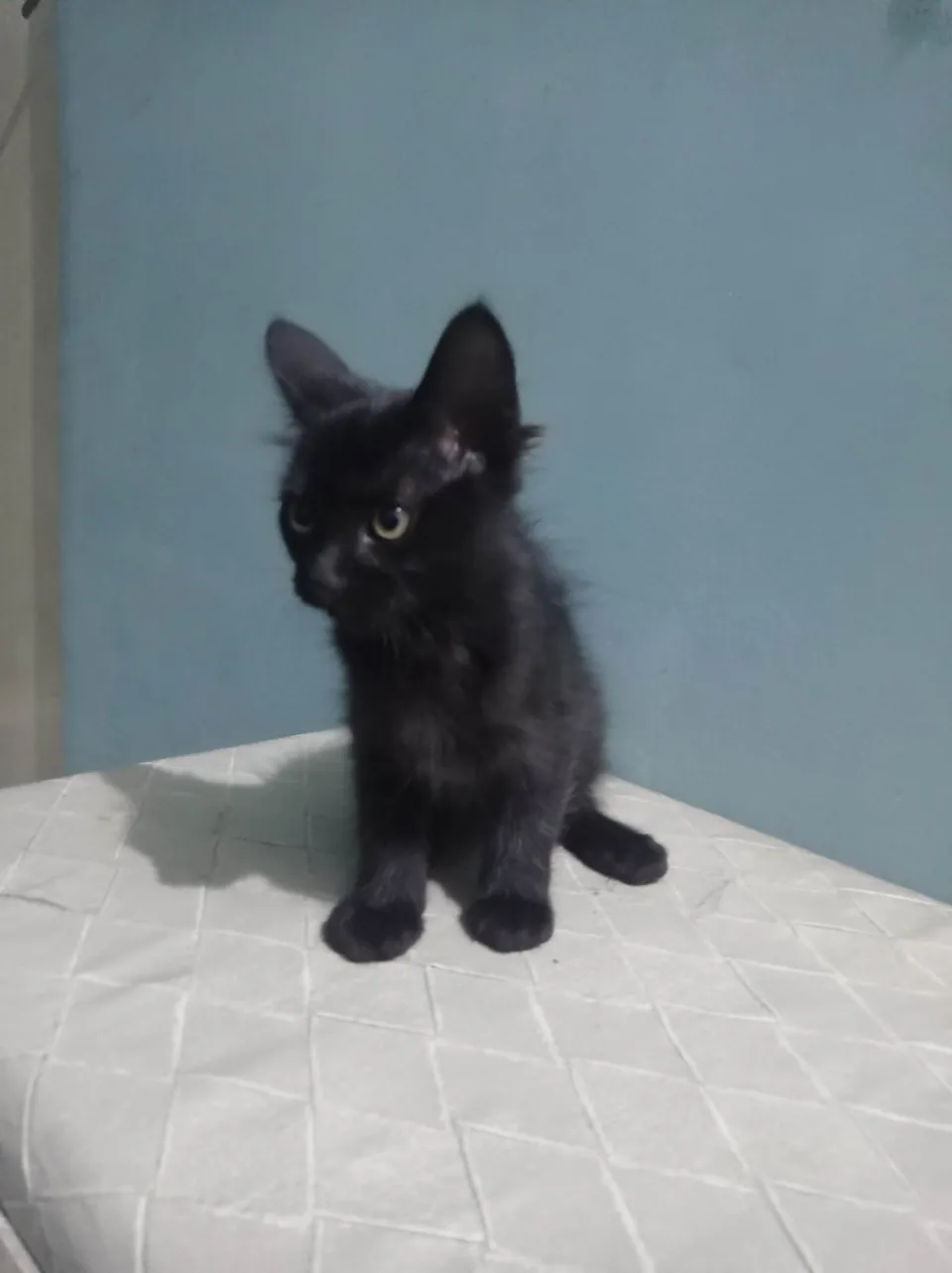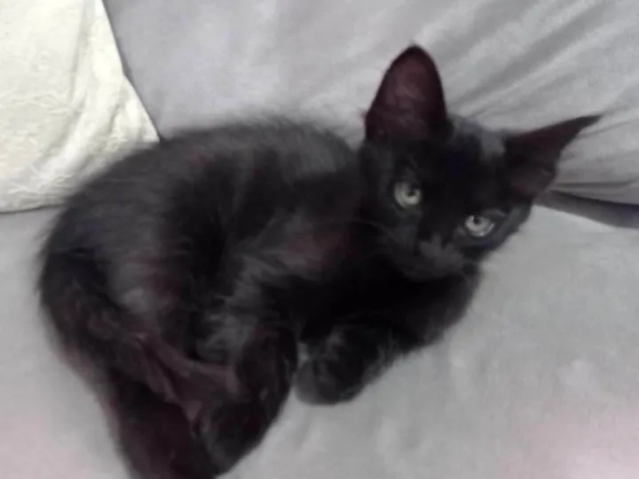 Filhote que minha gata preta teve, (29/03/2025) ela não é muito sociável com estranhos mas não chega a ser agressiva, só é um pouco medrosa. Limpinha, faz tudo na areia certinho
