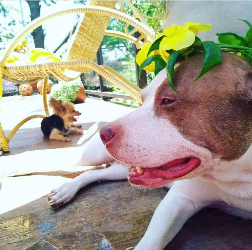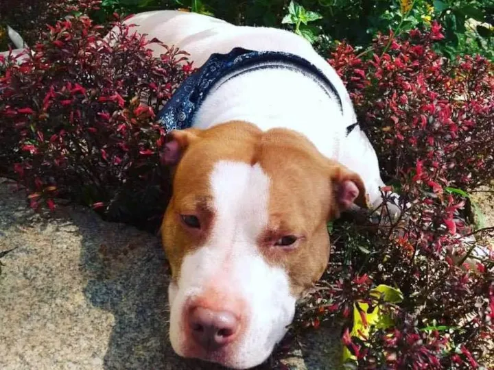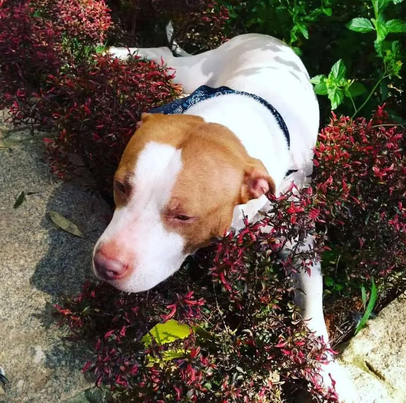 Pitt Bull fêmea, branca,que atende pelo nome de Maya
