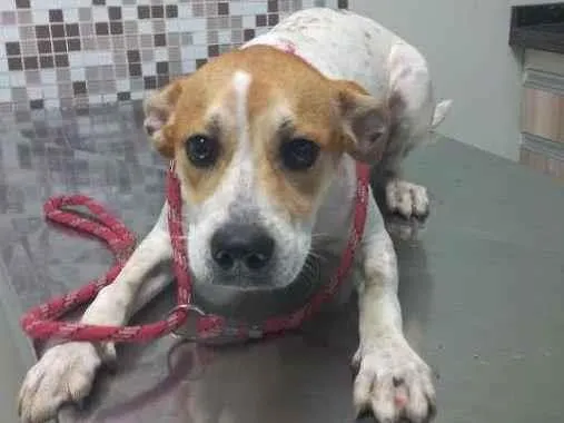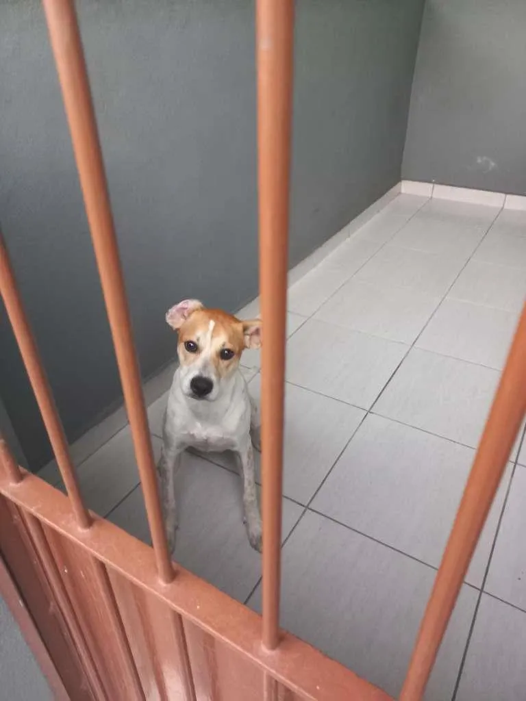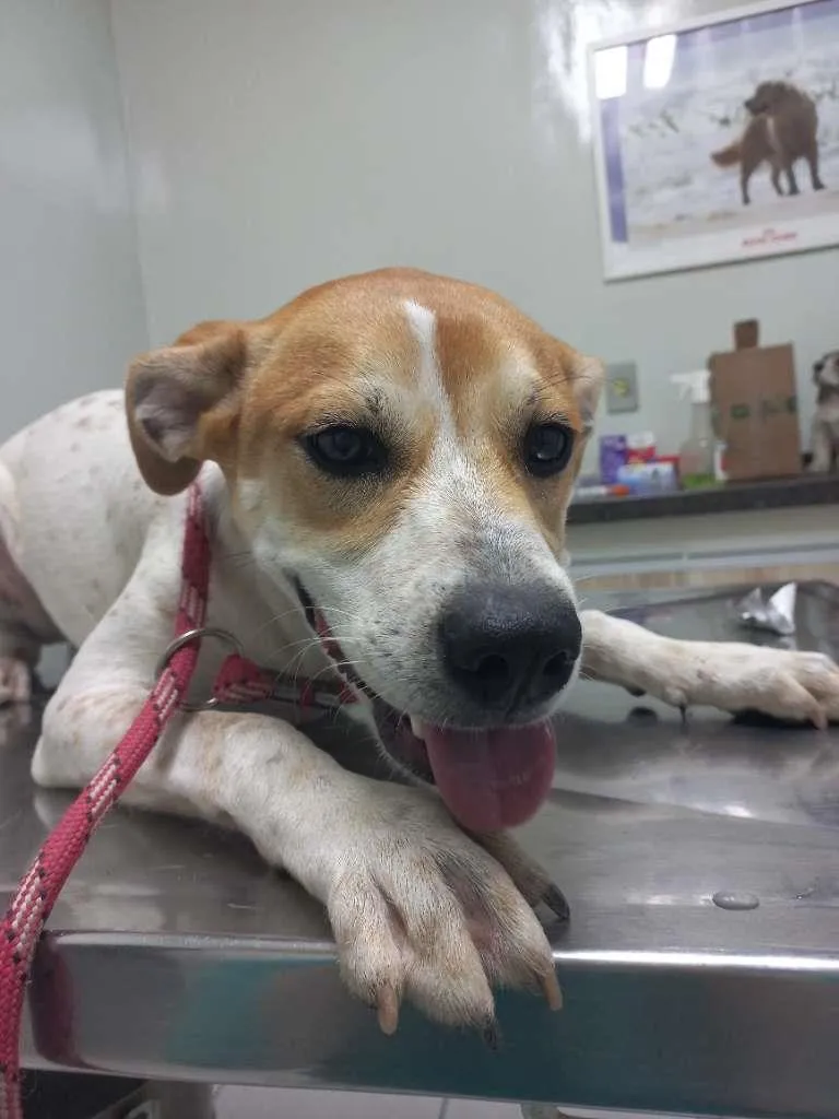 Sou branco e com manchas caramelo pelo corpo. Meu rostinho é quase todo caramelo,