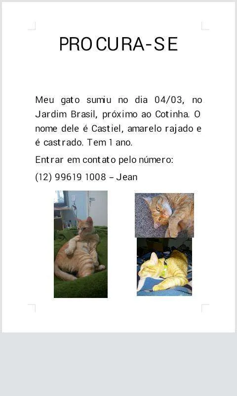 GATO CASTIEL, AMARELO RAJADO POR INTEIRO, CASTRADO E CHIPADO NA REGIÃO DORSAL SOB O NUMERO 963008001134218. SE PERDEU EM ARARAQUARA NO BAIRRO JARDIM BRASIL, ESTAVA NA CASA PARA N, 385. SUA TUTORA É DA CIDADE DE JACAREI E CASTIEL FOI NO FERIADO DE CARNAVAL PARA A CIDADE DE ARARAQUARA . PORÉM , JÁ NO 2 DIA, CASTIEL FUGIU E ATÉ O MOMENTO ESTAMOS PROCURANDO EM GRUPOS DE PROTEÇÃO AOS ANIMAIS.