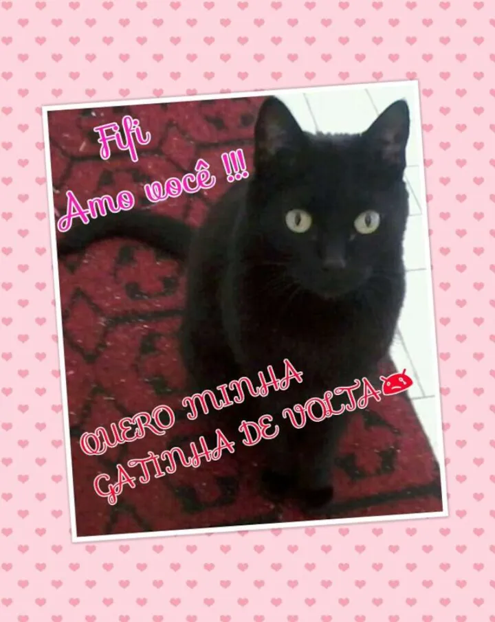 eu amo muito ela, tenho ela como filha, peguei da rua não era nem desmamada ainda,cuidei dela desde os primeiros dias de vida...um dia ela saiu e não voltou mais, ela é muito meiga,carinhosa,gosta de colo, é castrada tem 9, atende pelo nome Fifi.