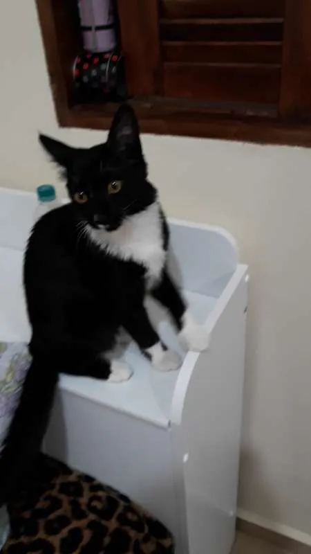 Desaparecido no bairro Jardim Flórida. Gato jovem de porte médio, pelagem preta da cabeça ao rabo e branca do pescoço às patas. Possui uma machinha branca abaixo do nariz e no queixo, orelhas pontudas e rabo comprido e bem peludo, bigodes compridos e brancos e olhos amarelos. Gato bem próativo.