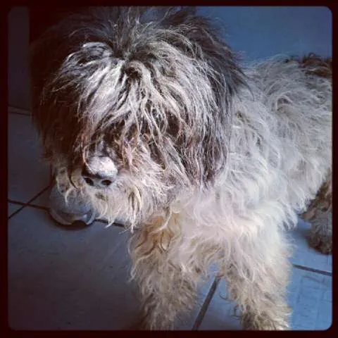 Robinho foi resgatado na rua, com o pelo todo enroscado, com nós, magro e triste. O apelidamos de Bob Marlei de início, pois os pelos dele pareciam cabelos com dread.. até surgir o nome Robinho.
