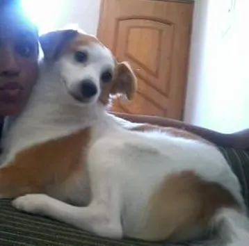 Pequeno peludo em algumas partes do corpo branco tem manchas marrom meio laranjas muito bonito