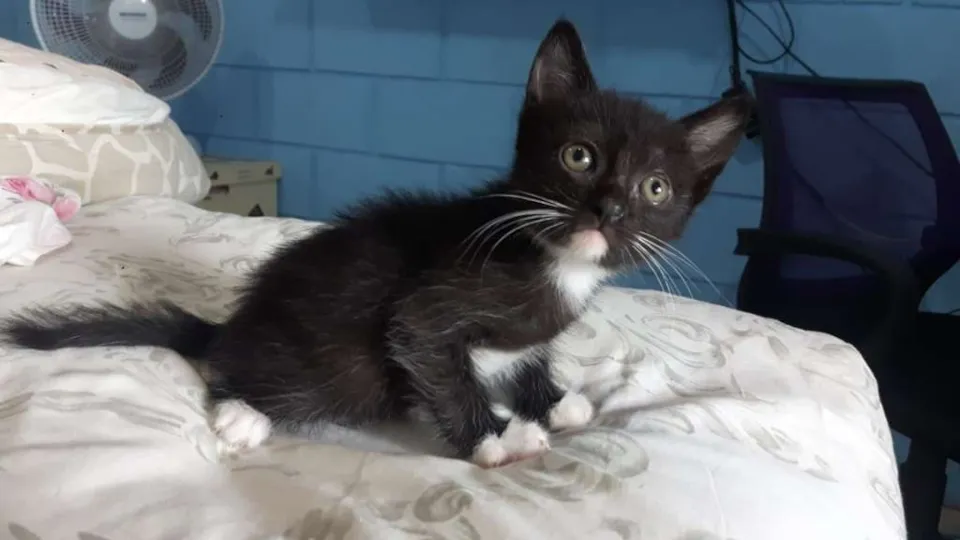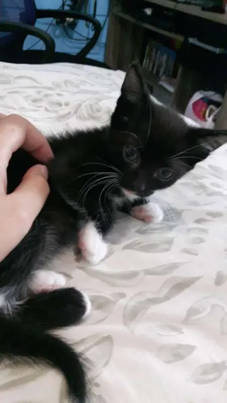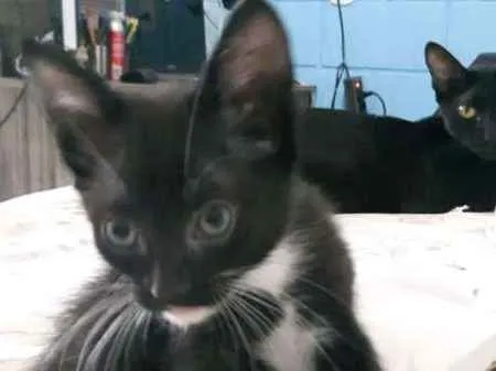 São dois machos e uma fêmea. Eles tem pelo médio/longo, que provavelmente vão ficar longos quando crescerem. São pretos mas com a barriguinha e patas brancas. O macho que tem rabinho quebrado é bem peludo e cinza nas patas.