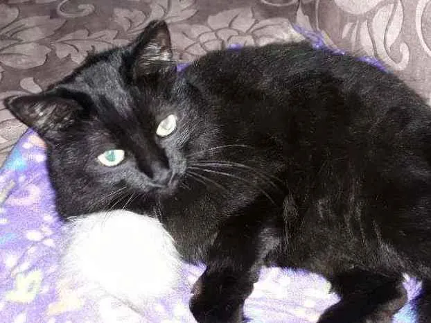 Gata castrada. Toda preta e bem peluda. Apenas um tufinho branco no peito. Olhos verdes e bem boazinha.