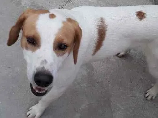 Cachorro porte médio, branco e marrom. Ótimo cão guarda e dócil com as pessoas de casa.