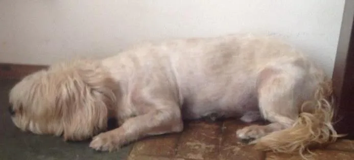 Tosado, no zero,menos na cabeça,, rabo quebrado, tem medo de chuva e trovão, fogos tem 12 anos