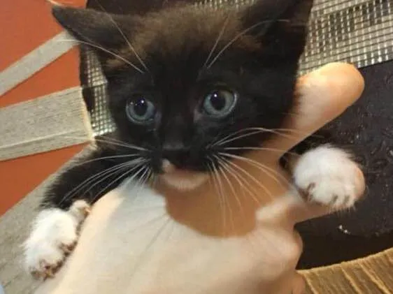 Estou doando esse gatinho preto e branco que precisa muito de um lar, tem dois meses e já come ração