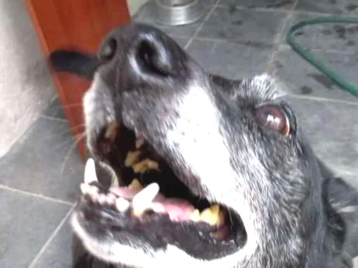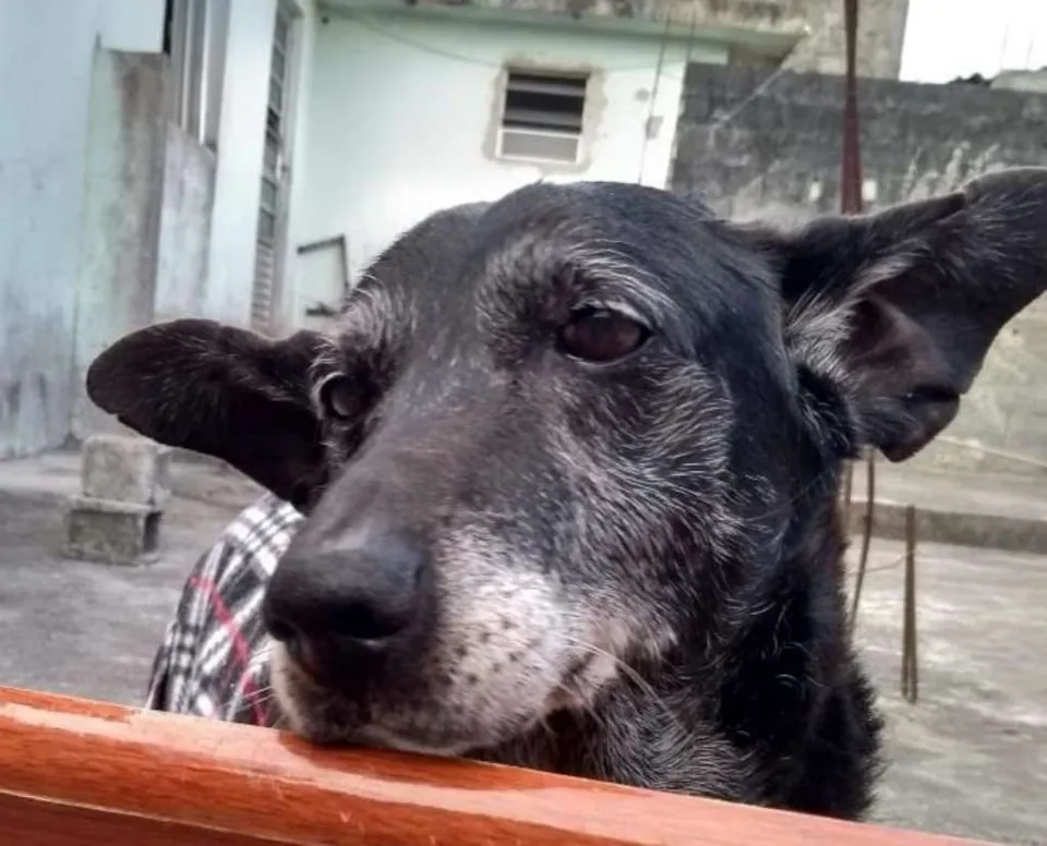 já é um cão idoso, tem alguns pelos brancos pela idade, anda bem devagar e mancando um pouco e tem um pequeno caroço na cabeça. Está com uma coleira anti-pulga