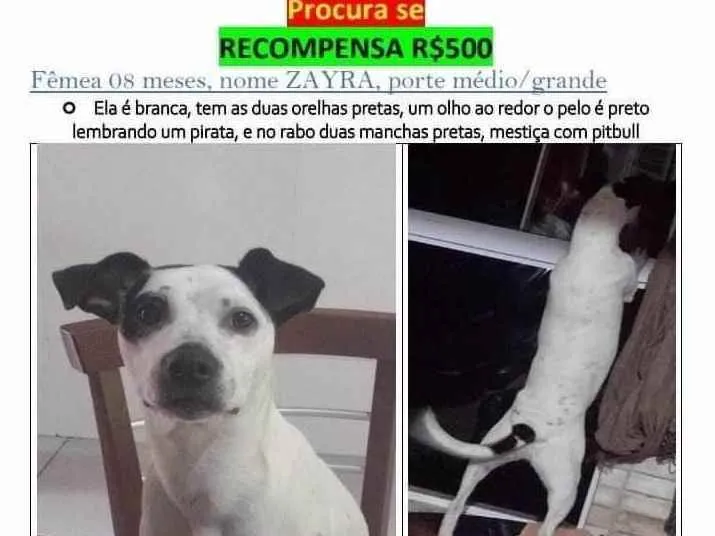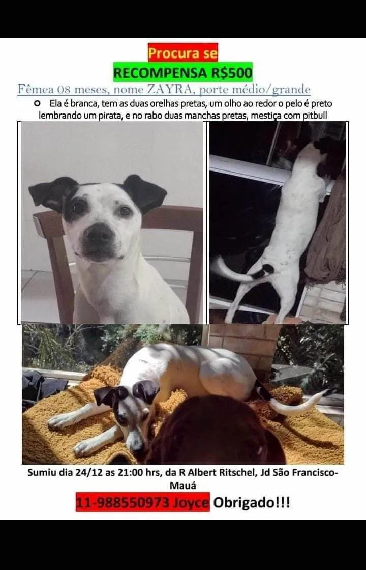 Zayra fugiu na véspera do Natal, no jardim São Francisco em Mauá. Tem 08 meses, é bem agitada, brincalhona e mansa. Porte medio, Grande